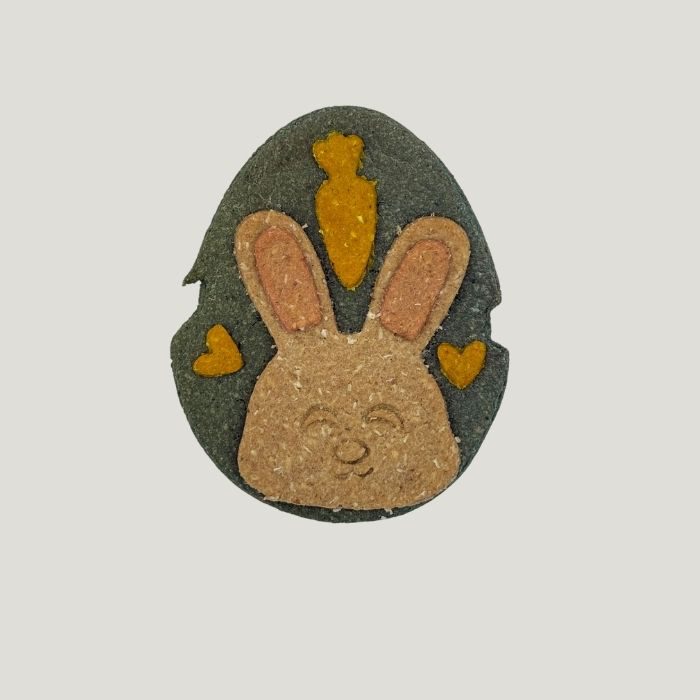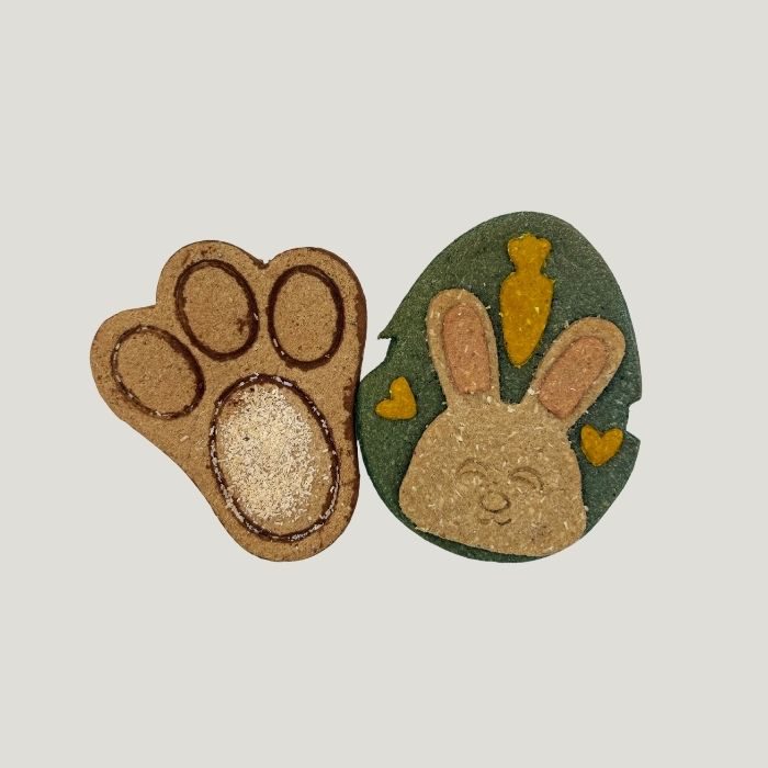 - Pack Pascua Select (60g): Dos grandes petgalletas crujientes (una carita de conejo sobre prado verde y una gran huella con bordes oscuros) presentadas en su blíster transparente protector.