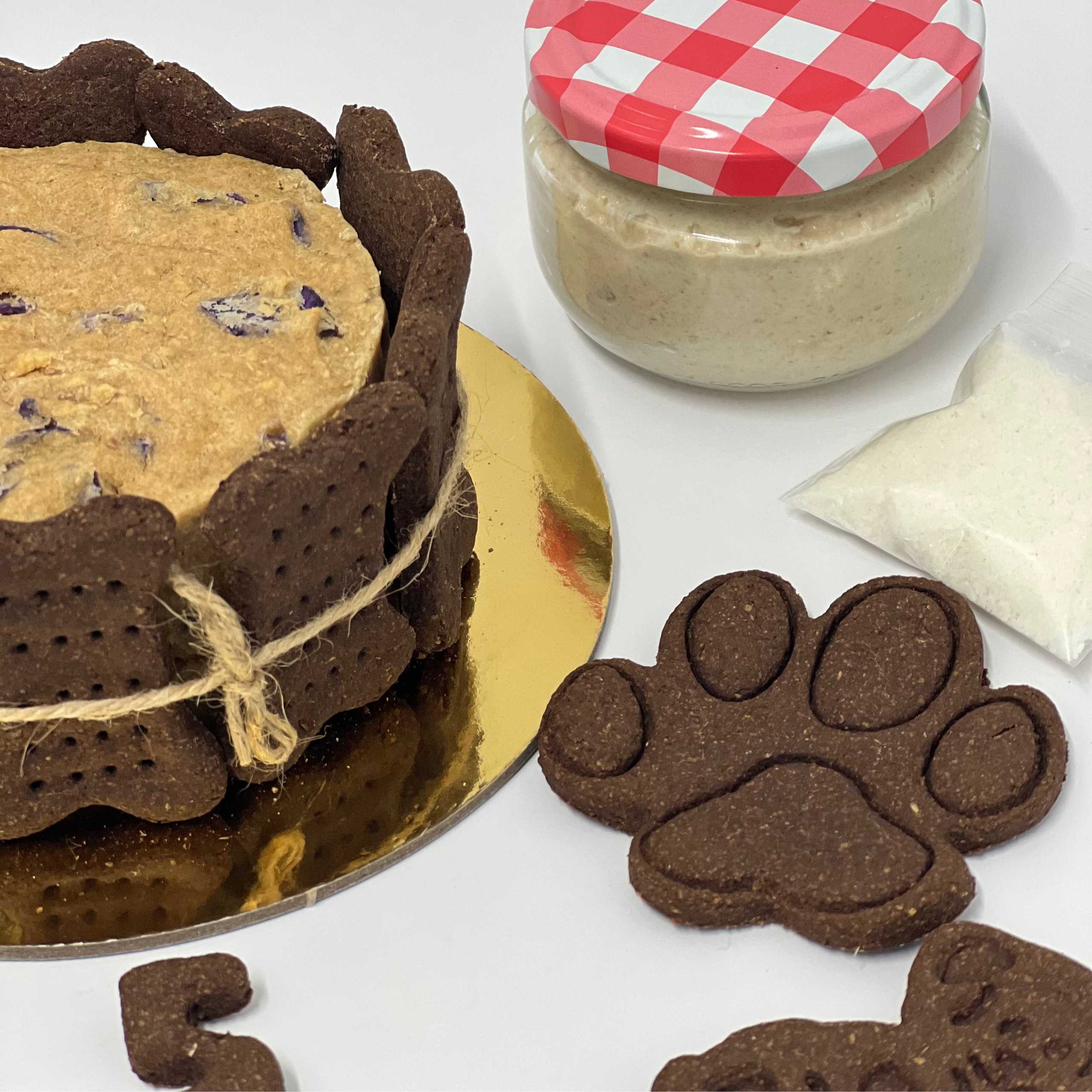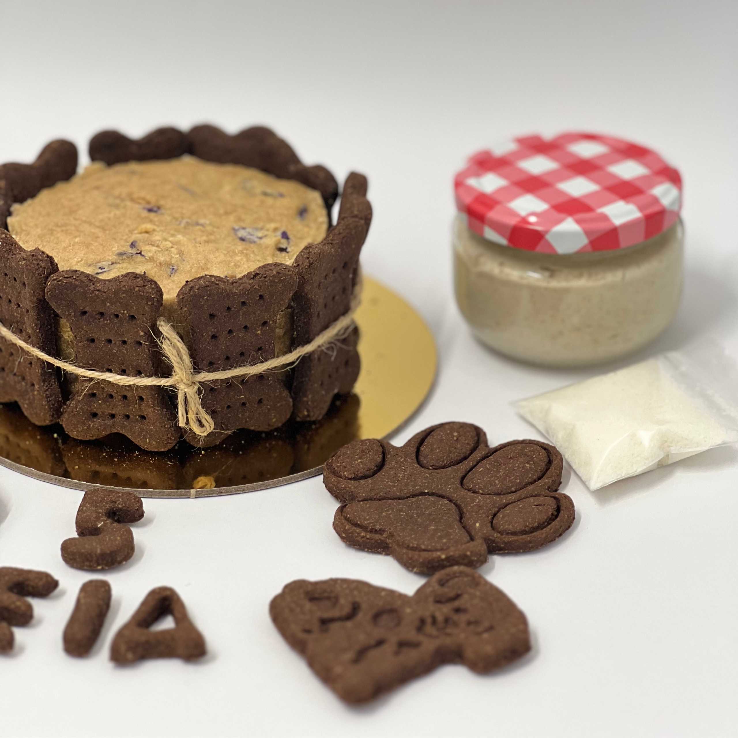 La tarta es un bizcocho blandito, elige entre algunos de nuestros tamaños y colores de petgalletas, la tarta de tu peludo vendrá decorada con una deliciosa crema pastelera adecuada para ellos, hecha a base de Yogurt Griego sin azúcar. ¡CLARO! podrás personalizarla con el nombre de tu peludo y los años que cumple, además esta decoración la acompañaran 4 petgalletas de más, en forma de huella, perrito y huesos grandes. Además, traerá un topping de coco para espolvorear por encima de la tarta una vez la hayáis decorado para darle el toque final.